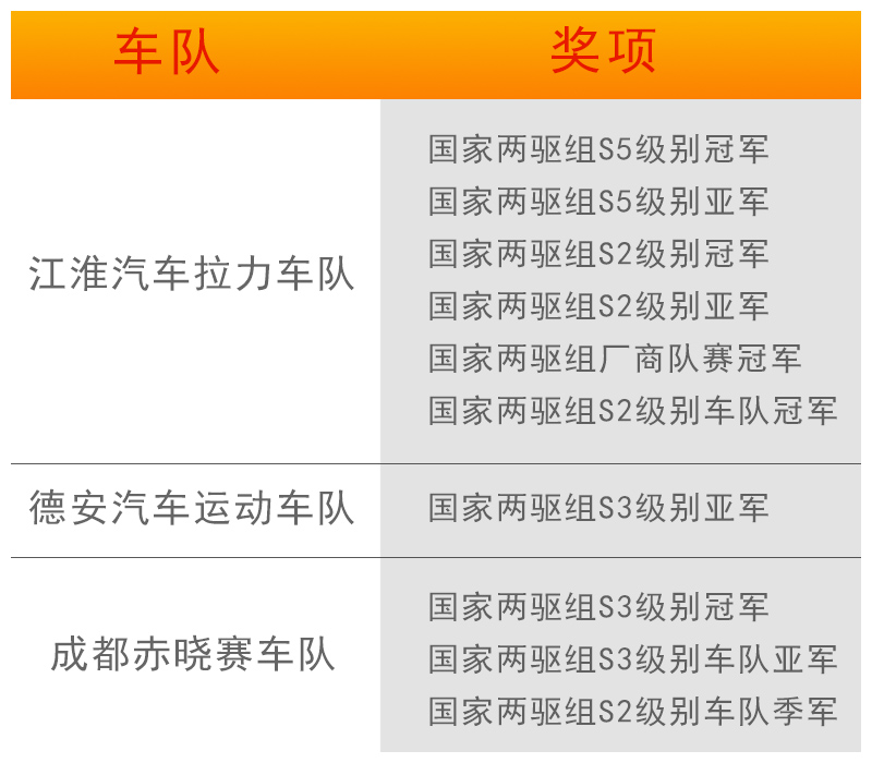 紅魔江淮軍團(tuán)再次創(chuàng)造奇跡,保持了90%的完賽率,一舉拿下國家兩區(qū)組廠商隊(duì)賽冠軍、S2級別車隊(duì)冠軍。除此之外,淮汽車?yán)囮?duì)的王浪濤/楊林以及余承磊方軍衛(wèi)車組榮獲國家兩驅(qū)組S5級別冠亞軍,江淮雷力拉力車隊(duì)的李大威/閆孟瀅車組則是上演四連冠,繼續(xù)在國家兩驅(qū)組S2級別中拔得頭籌,和隊(duì)友潘東/王恩車包攬兩驅(qū)組S2級別冠亞。