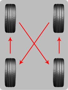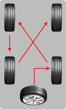 如果輪胎的磨損情況嚴重,建議使用如圖的方式交換前后輪胎,這樣可以使得所有輪胎保持大致相同的損耗。 |